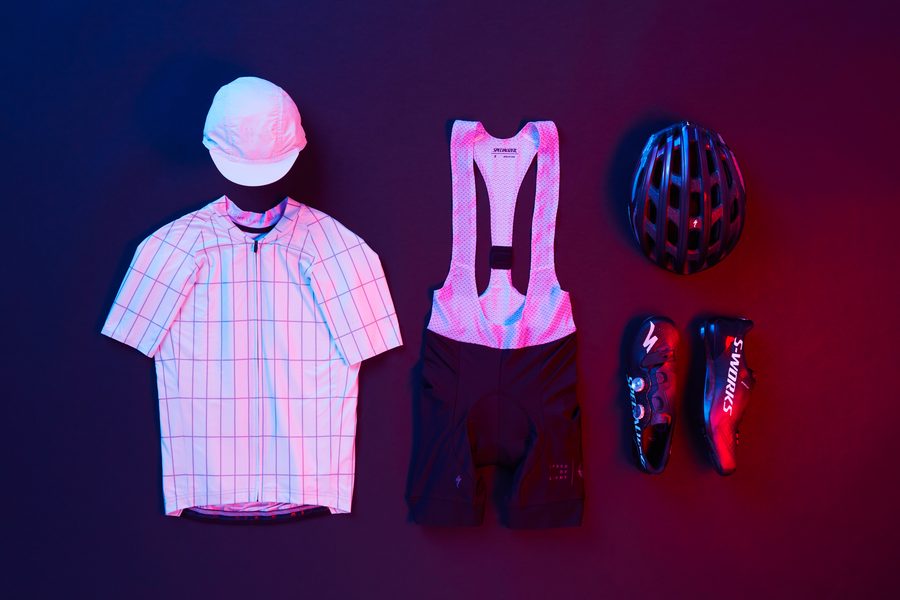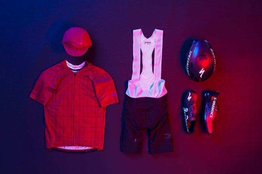Speed of Lightコレクションは、この光と闇の表裏一体の関係と、光と闇が交錯する近未来的な街並みを駆け抜けるスペシャライズドのアスリートをイメージしてデザインしました。光と闇がそうであるように、バイクとエキップメントが相互に性能を引き立てる、美しいコレクションです。