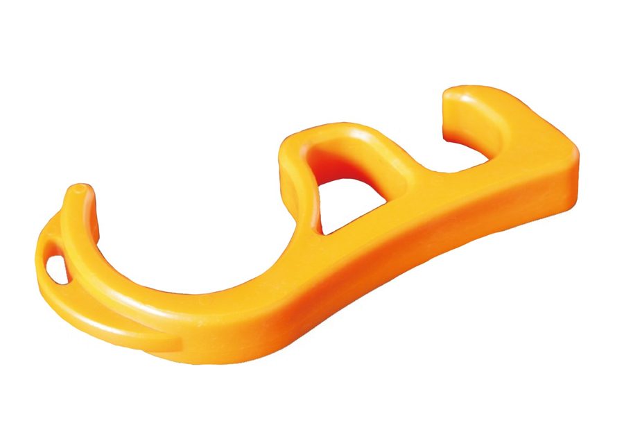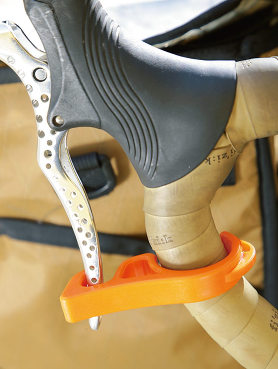本来の使い道はオートバイ用の簡易パーキングブレーキだ。これでギュッと固定することで、車体が動かなくなる。ロードバイクでも、荷物が重かったり、傾斜地だったりすると、停車の際にズルズルと動いてしまう。そんなときはコレでピタッとストップ。メンテの際など車輪を上げる場面でも片輪が固定されていると安定する。じつは、われわれ自転車雑誌職人は撮影の際、自転車をクリアー棒で立たせる。そんなときも車輪をロックできると格段に安定。いままではキャリパーブレーキのケーブル調整ネジを回していたが、ディスクブレーキロードの登場でそのテクが使えなくなって困っていた。これを見たときコレだー!と思ったワケ。さっそくスタジオの備品となった。
