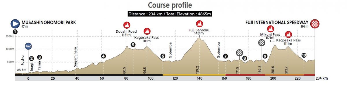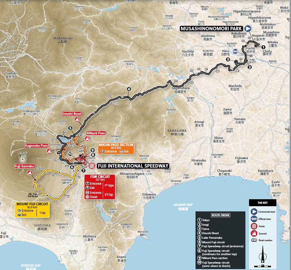 いよいよはじまる東京五輪ロードレース男子。パレードスタートは11時、そしてリアルスタートは多摩川を渡る是政橋となる。そして富士スピードウェイへの予想フィニッシュタイムは17時過ぎとみられている。6時間を超える長丁場だ。ここではコースの見どころの通過予想タイムを見ていこう。あくまでも平均時速での予想タイムなので、レース前半はこの予想タイムより速く通過することになりそうだ。