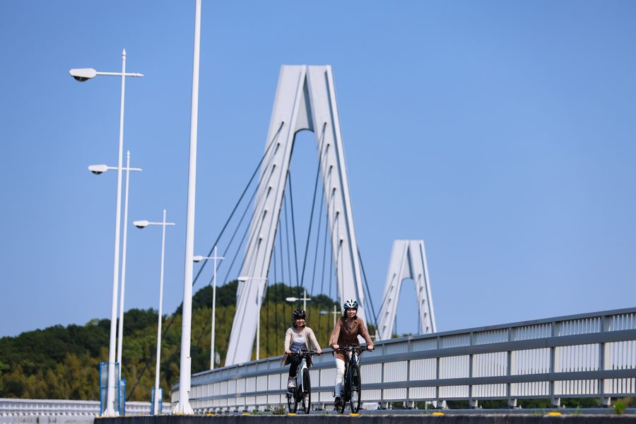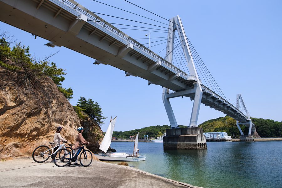 上島町弓削離島体験交流施設「せとうち交流館」でeバイクをレンタルした二人。まずは弓削島(ゆげしま)と佐島を結ぶ弓削大橋を走り抜け、佐島の東側を目指します。