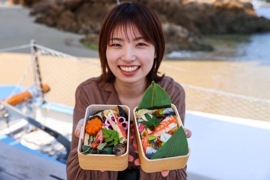 今回、上島町在住の女子二人が紹介するアクティビティは、カタマランヨットを使ったクルージング体験。探検コースではeバイクをヨットに載せ、島から島へ探索もできちゃいます。島の寿司屋さんで販売している「ゆげ海の駅弁」もおすすめです!