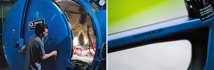 精密にカッティングされたカーボンシートの貼り付けから成形までイタリア生産を貫き、高い品質管理を守り続ける。大型の圧力窯で樹脂を硬化させて高品質なフレームを製造するオートクレーブ製法を採用する。ディアマンテSVは高弾性素材のハイモジュラスカーボンにより、高剛性で軽量なレーシングバイクを実現する