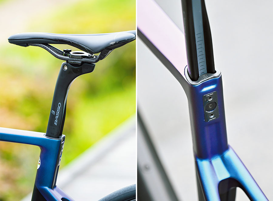 スタイリッシュなインテグレーテッドシートポストは、シートチューブ背面から押し子を当てる構造。3点固定により確実な固定力を約束する。シートポストとシートチューブ間に挟むラバー製のマチは、振動減衰機能を果たす