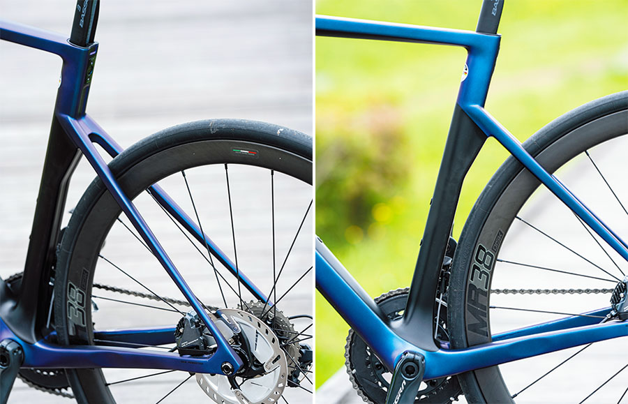エアロロードのトレンドであるシートステーの位置を下げたコンパクトリア設計を採用。エッジのきいたシートチューブやつぶしのあるチェーンステーが剛性を高めパワー伝達性も高める。タイヤクリアランスは最大32mmまで飲み込み、昨今のワイドタイヤにも対応するトレンド設計が特徴