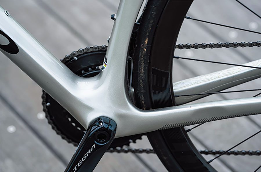 右/シートステー取り付け位置を下げるトレンドを採用。チェーンステーにつぶしを設けるなど細部までこだわる