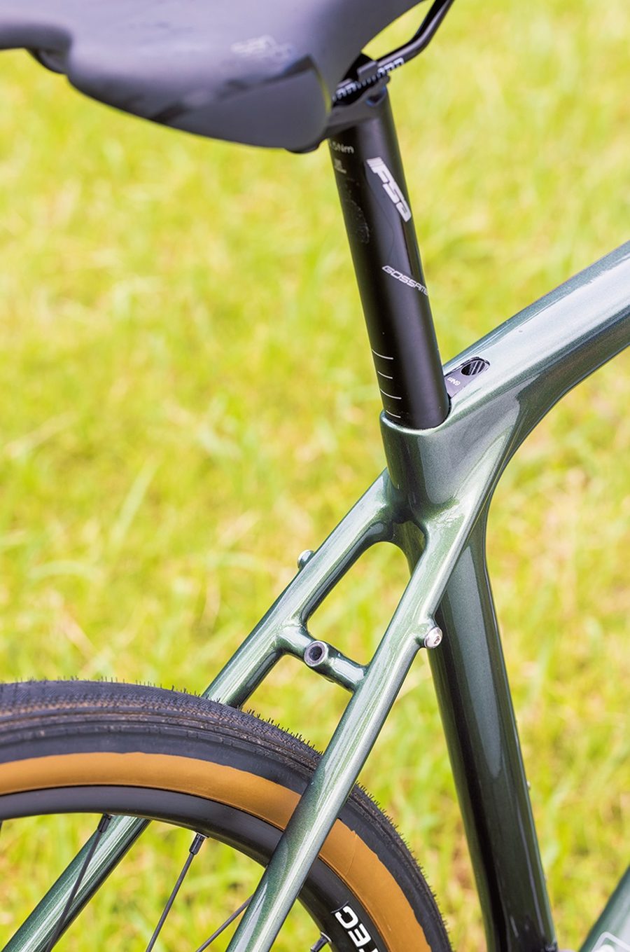 シートステーにはブリッジを設けてフェンダーの取り付けを可能にした。サイドのダボにはキャリアをマウントできる