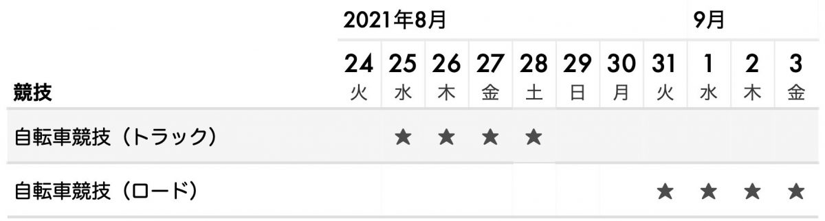 自転車競技は開会式の翌日の8月25日から27日までトラック種目が実施され、ロード種目が8月31日から9月3日まで開催となる。なお、すべての競技が無観客での開催となる。