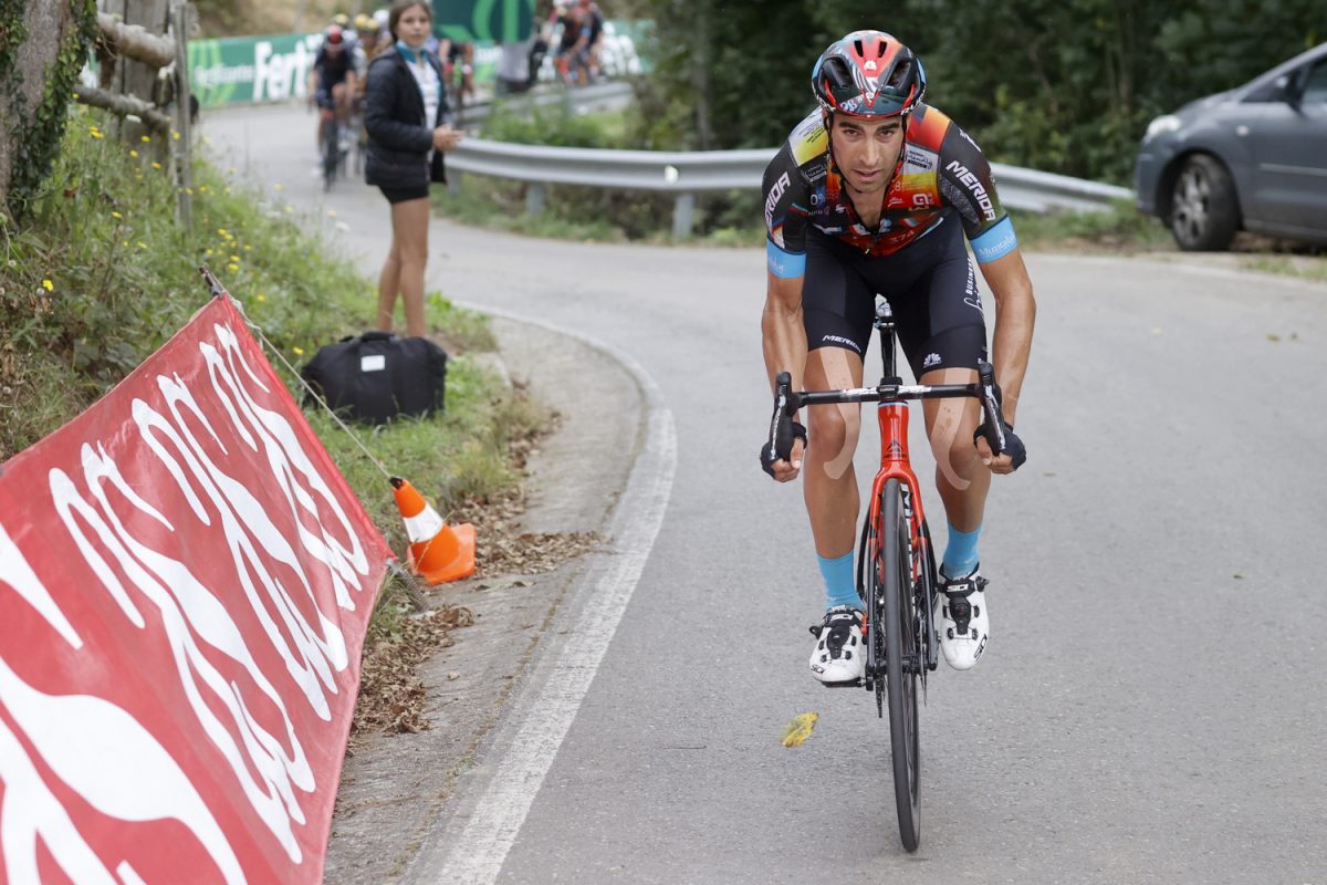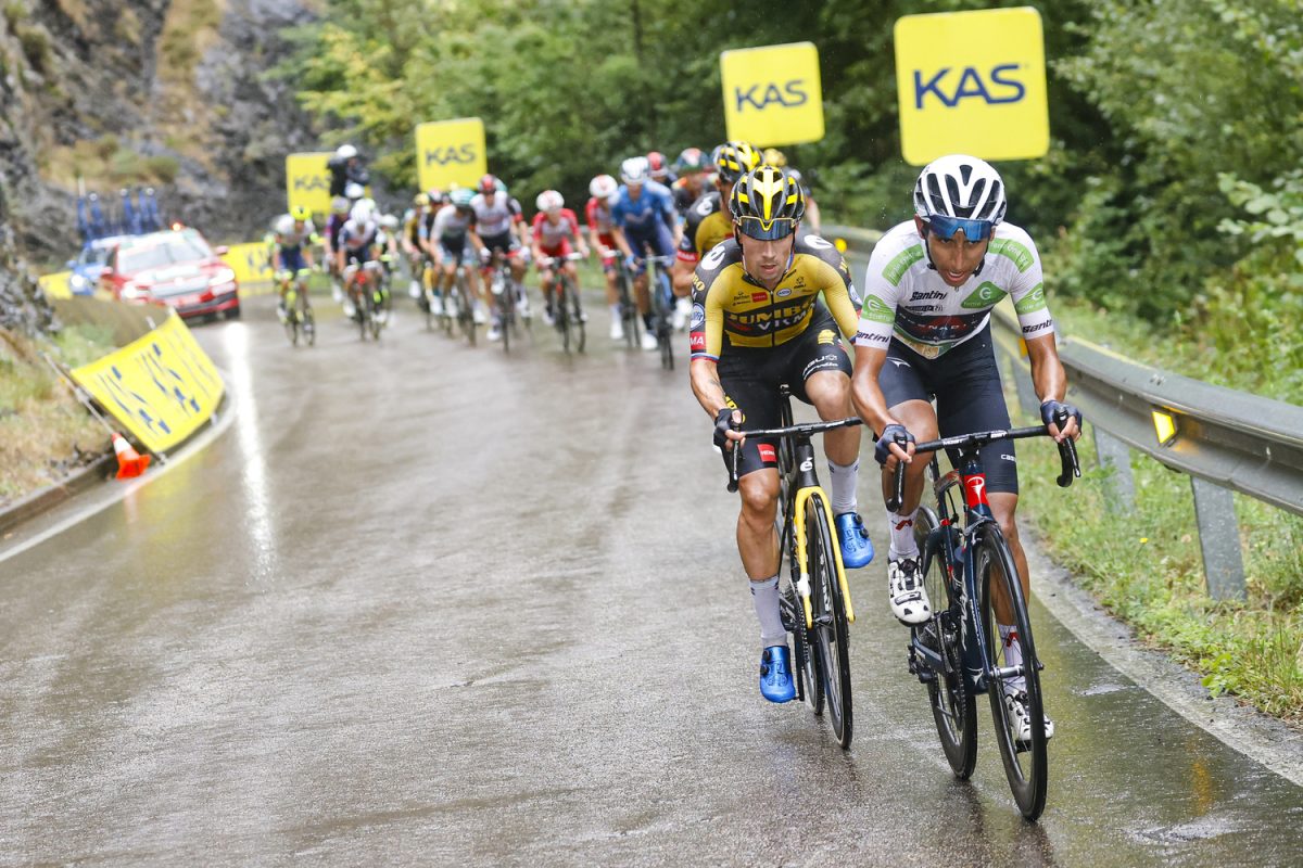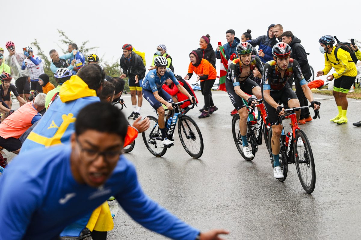 出入りが繰り返される状況に変化が見られたのは、1級のラ・コリャダ・リョメナ登坂1回目。約30人が集団を飛び出したのち、この上りで4人が先行。さらに9人が追走し、中腹で合流。1分前後のタイム差で続くメイン集団からミケル・ランダ(バーレーン・ヴィクトリアス、スペイン)もアタックし、すぐに先頭グループまでブリッジ。こうしている間に頂上へ到達し、今大会好調のマイケル・ストーラー(チームDSM、オーストラリア)が1番に通過。タイミングを同じくして、メイン集団ではマイヨロホを着るオドクリスティアン・エイキング(アンテルマルシェ・ワンティ・ゴベールマテリオ、ノルウェー)がハードな上りに耐え切れず遅れ気味に。その後の下りで集団へと戻るが、ジャージキープは厳しい情勢となっていく。