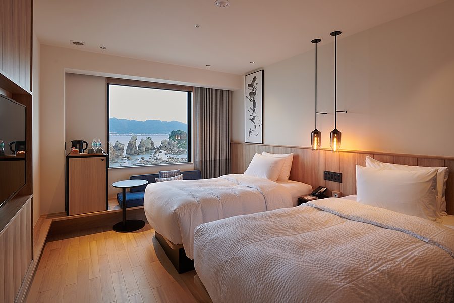 ホテルに戻ると、窓には夕日に染まる橋杭岩が絵画のように映し出されていた。