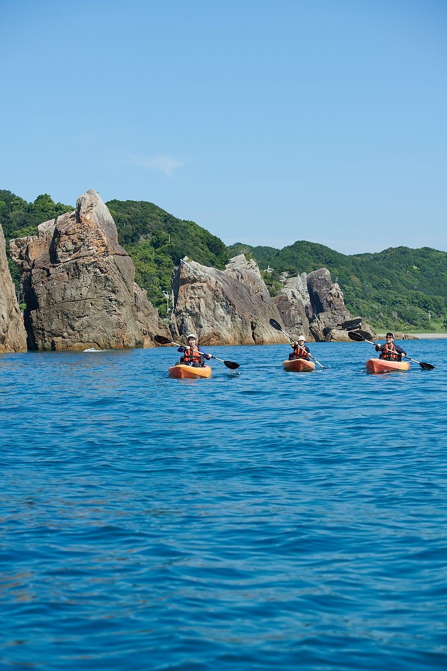 橋杭岩はマグマが板状に固まった岩脈。虫や微生物が住むような岩肌ではなく、石のようになめらか。そこに波がおだやかにあたり、間近で見ると、それがなんともきれいだった! 透き通った水の中を魚が泳ぎ、シーカヤックはその上を滑り、橋杭岩の間を抜け、小さな岩を避けながら進んだ。浅瀬には岩床が広がり、心拍数は落ち着いていた(笑)。