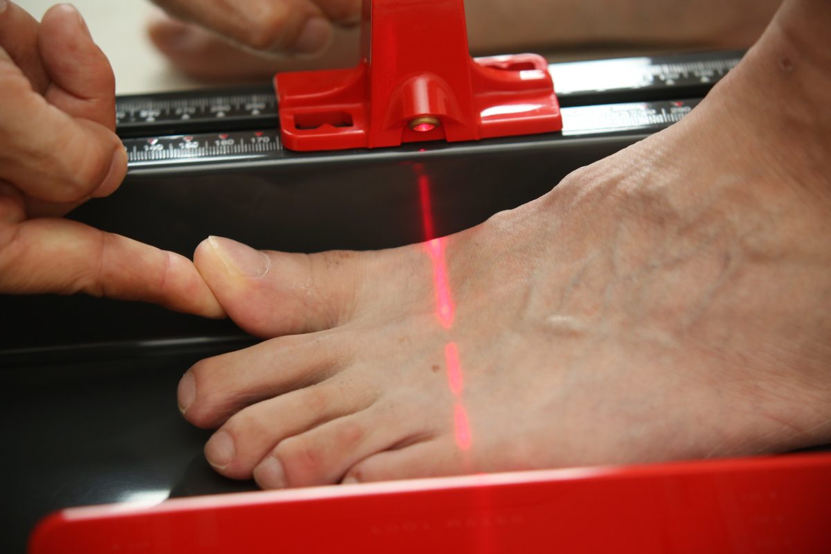 専用の什器を使い、足の長さ、幅を調べる。さらにフィッターが足の親指を持ち上げ、谷になっているところからかかとまでの距離(=かかとから中足骨までの距離)を調べる。これを左右同じように行う。測定はレーザーを使って行うため、かなり正確に測れる。