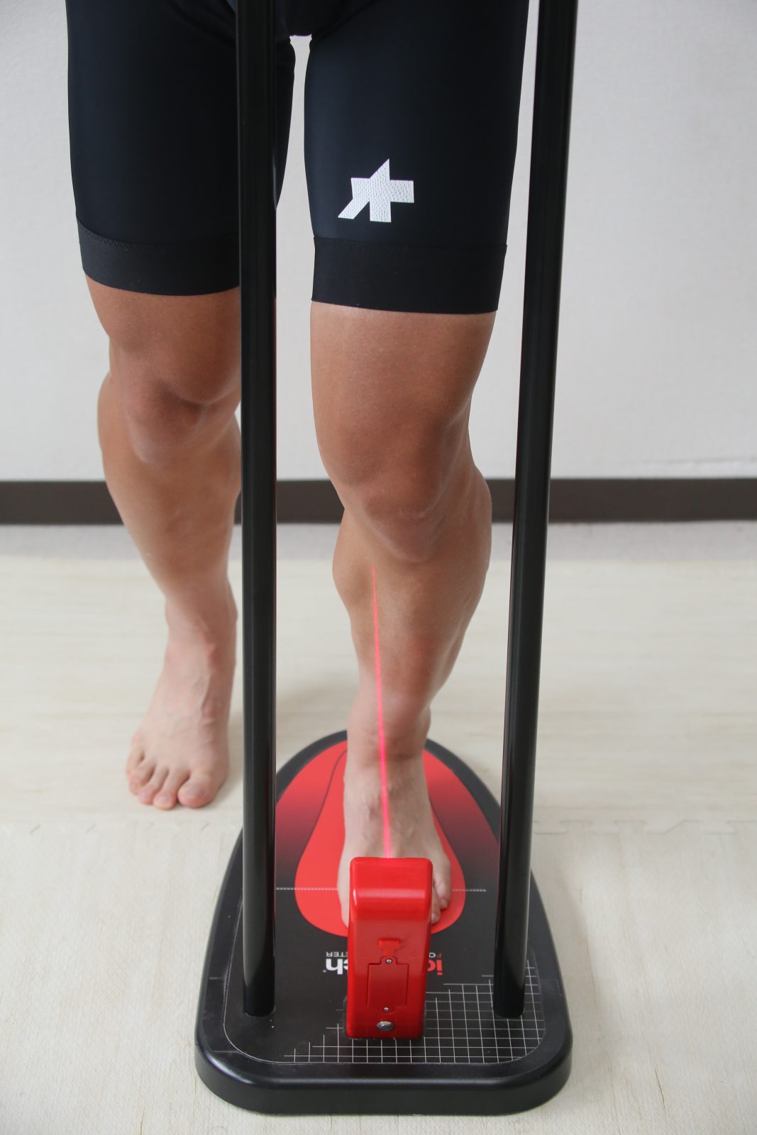 ペダル軸は常にまっすぐだが、足はショパール関節(横足骨の関節)の前後で足がねじれている場合があり、ねじれているとペダリング中にひざが内側または外側に傾く。この工程では足がねじれてひざがまっすぐ曲がらないケースに当てはまるかを見ていて、ひざがまっすぐ曲がらない場合はクリート装着時にカントをつける必要があると判断する。