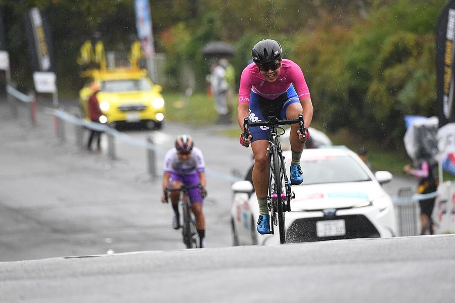 12周72kmで行われた女子のJフェミニンツアーDay1は、フェミニンリーダージャージを着る植竹海貴(Y’s Road)と、渡部春雅(明治大学)が交互にペースアップして集団の人数を絞っていく。レース後半までに残ったのは、植竹、渡部、唐見実世子(弱虫ペダルサイクリングチーム)、川口うらら(日本体育大学・オープン参加)の4名。9周目、渡部が波状攻撃をしかけると川口と唐見が遅れ、渡部と植竹の2名が先行。最終周回に入ると下りで渡部がアタック。植竹は大きく引き離されながらも追走し、残り2kmで渡部に追いつく。勝負は2名のマッチスプリントとなり、ハンドルの投げ合いに。判定の結果、僅差で植竹の先着が確定し、今シーズン10勝目を決めた。