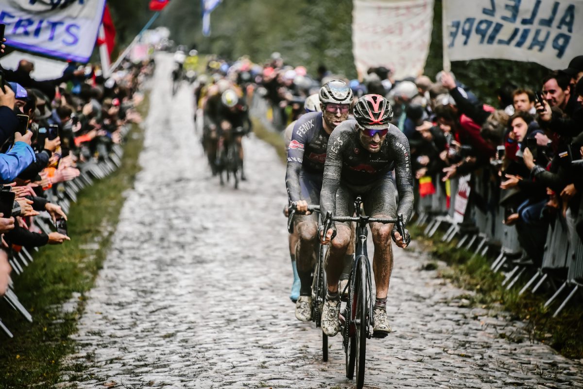 ファンデルプールは、コルブレッリ、ボワヴァン、プランカールト、ルクロックを引き連れたまま追走。パヴェを越えるたびにファンアールトらを含むメイン集団との差を広げていく。同時に前を走っていた選手たちをキャッチしながら順位を上げていく。タイミングを同じくして、先頭は人数が絞り込まれ、フェルメールス、トム・ファンアスブロック(イスラエル・スタートアップネイション、ベルギー)、ジャンニ・モスコン(イネオス・グレナディアーズ、イタリア)の3人となる。