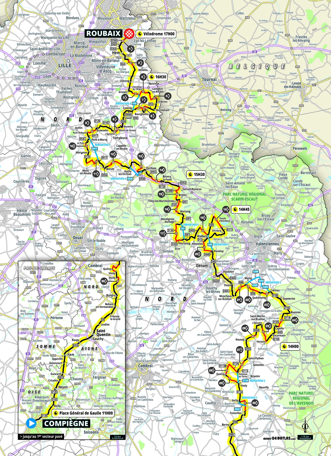 レースは、フランスの首都パリの北約80kmの街・コンピエーニュをスタート。東西へジグザグに針路を変えながら少しずつ北上し、ベルギーとの国境が近いルーベの街を目指す257.7kmのコースが設定された。