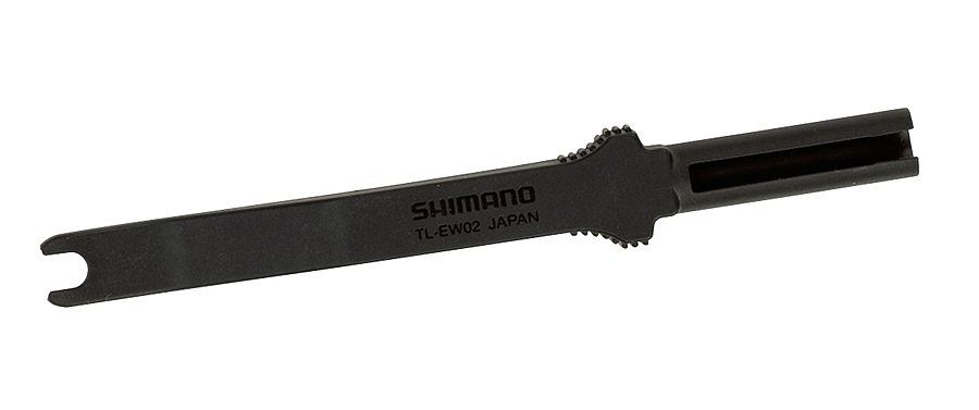シマノ純正のケーブル着脱専用工具で、左側が抜く専用、右側が差し込み専用。携帯工具などといっしょに携行すると、万一のときに安心。