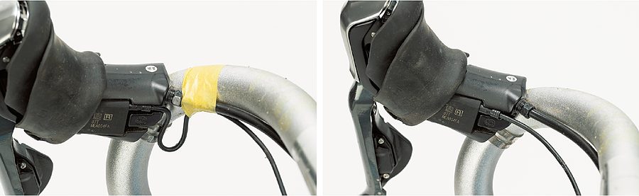 変速レバーのケーブルは、ハンドルを切ると引っ張られて抜ける恐れがある。落車時や輪行したときにも注意したい。チェックした際にケーブルに遊びがない場合は、ある程度たるみを持たせてビニールテープでとめるといい。