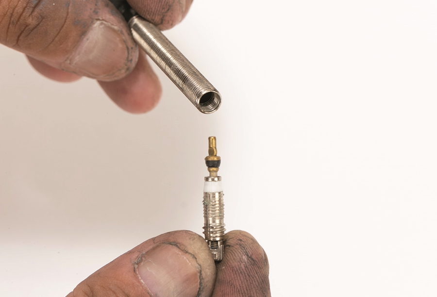 バルブコアを取り外すには専用の工具を使う。一般的にはバルブとセットで製品に入っていることが多い。