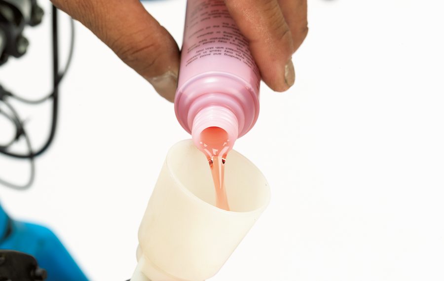 ファンネルにブレーキフルードを注ぐ。フルードはメーカーによって異なるので指定の純正品を使うこと。