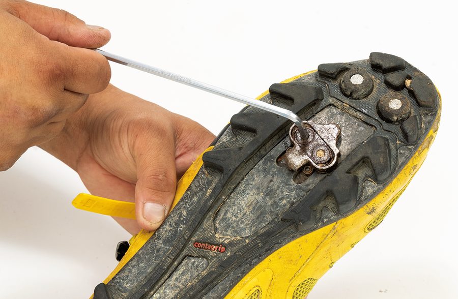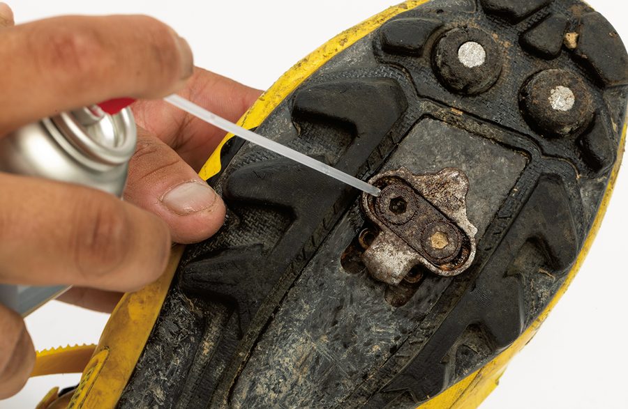 さびついたネジを外す際の基本は、CRCなどの潤滑剤スプレーを吹き付けて、しばらく放置して浸透したタイミングで回すことだ。SPDシューズのクリートなどでは、ネジ頭に入り込んだ異物を除去するのも重要で、工具がまっすぐ深く入ることにより高トルクで回すことができる。