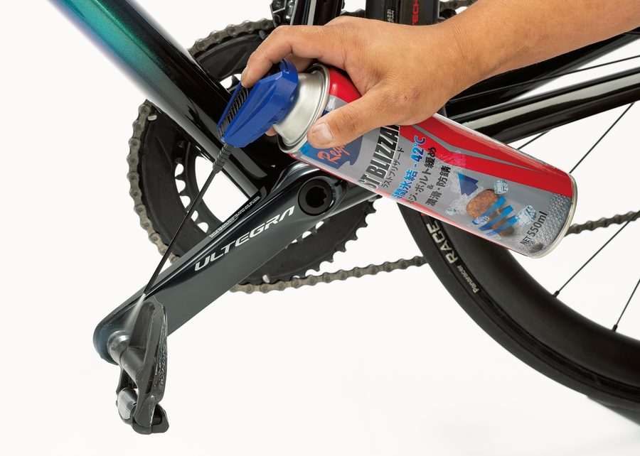 ラストブリザードは冷却剤で金属の体積を収縮させ、そのすきまに潤滑剤を浸透させてネジをゆるめやすくする。肌やタイヤなどには冷却剤をかけないように。