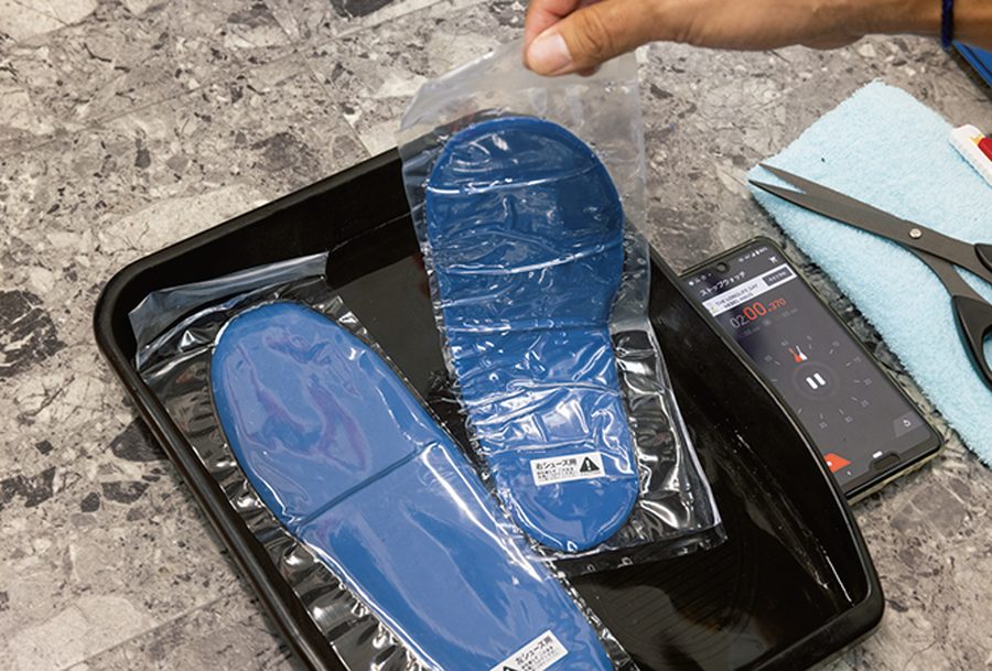 パックをはさみで開封し柔らかくなったインソールを出す。90秒以内につま先を合わせカカトまで伸ばすようにシューズ内に入れる。