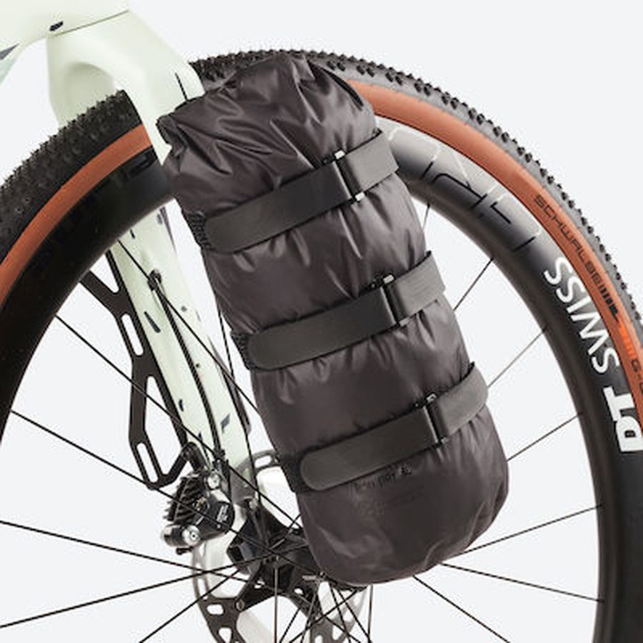 バイクパッキングの冒険中に雨や濡れて泥だらけの状況に遭遇した場合、大切なギアを濡らさないことが重要です。そこで、「キャニオン LOAD 5ℓドライバッグ」の出番です。わずか48gの軽量な防水生地で作られたこのバッグは、「キャニオン LOAD Grizl フォークケージ」にベストマッチ、大型のサドルバッグやバックパックにも収納可能です。また、バッグには留め具となるバックルが付いており、ハンドルとしても使用できます(写真のベルクロストラップは、「キャニオン LOAD Grizl フォークケージ」の付属品です)。