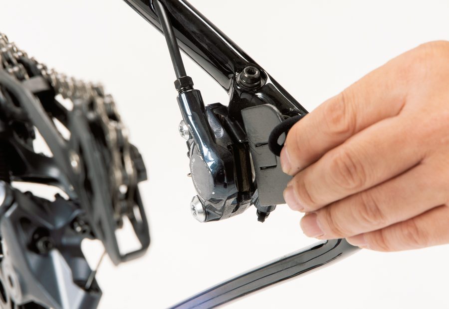 油圧式のディスクブレーキの場合、ホイールを外してローターがない状態でブレーキレバーを握ってはいけない。キャリパー内でブレーキパッドを押し出すピストンが飛び出してしまい、パッドが元の位置に戻らなくなってホイールがはめられなくなってしまうからだ。輪行時はホイールを外すので、このようなトラブルが起こりがちだ。ホイールを外したら、すぐにキャリパーのブレーキパッドの間にスペーサーをはさみ込もう。スペーサーがローターの代わりになって、トラブルを防いでくれる。