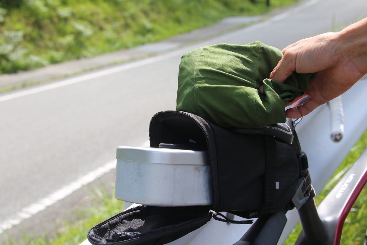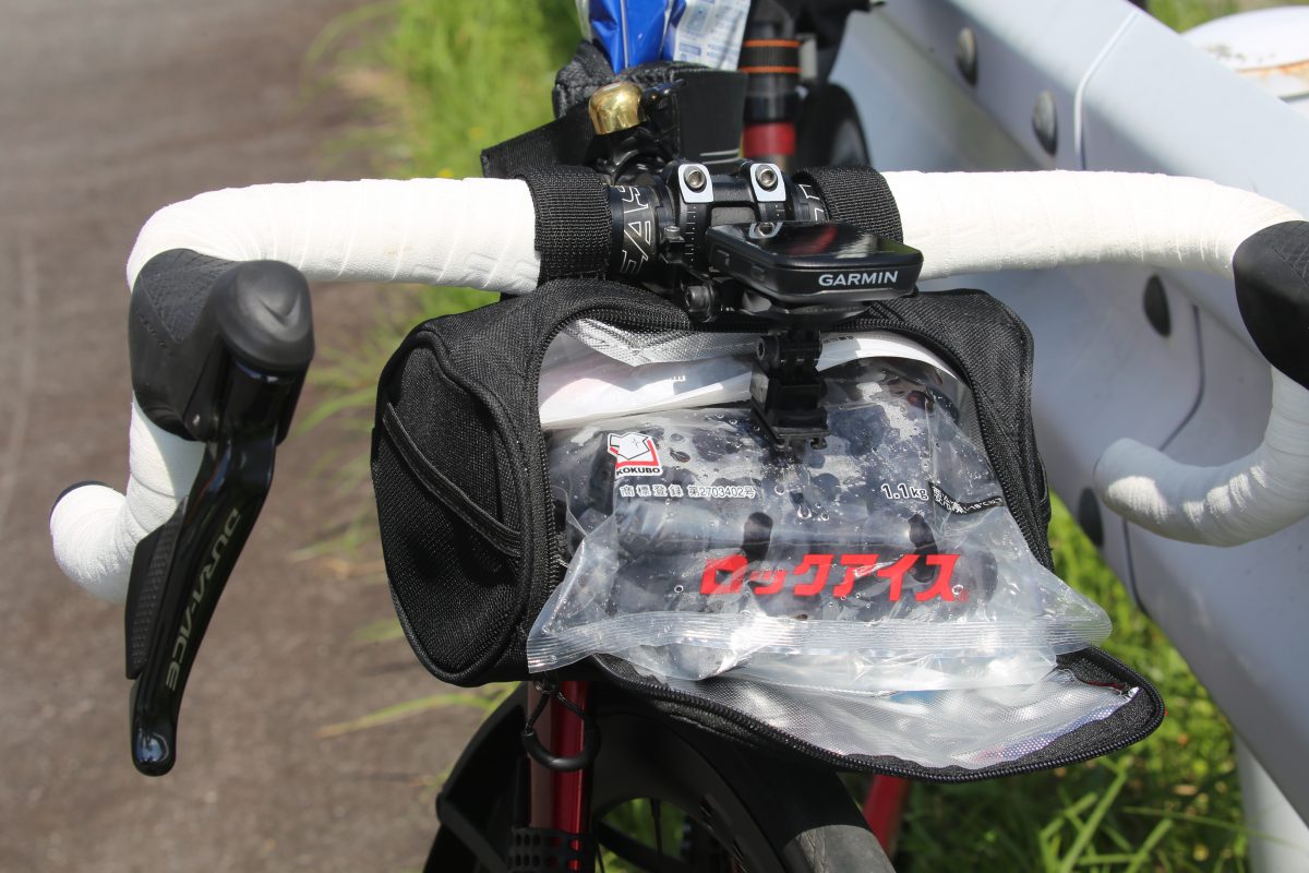 初めて走る道にワクワクしつつ自転車の準備をした。今回はリュックサックを背負うのではなく、自転車に装着するバック類を色々と取り付けてみた。まずは峠でコーヒーを飲むための道具、そしてフロントバックには“山梨”と言えばブドウだろうと道中の農家さんで手に入れたブドウを、氷を仕込んだフロントバッグに入れた。