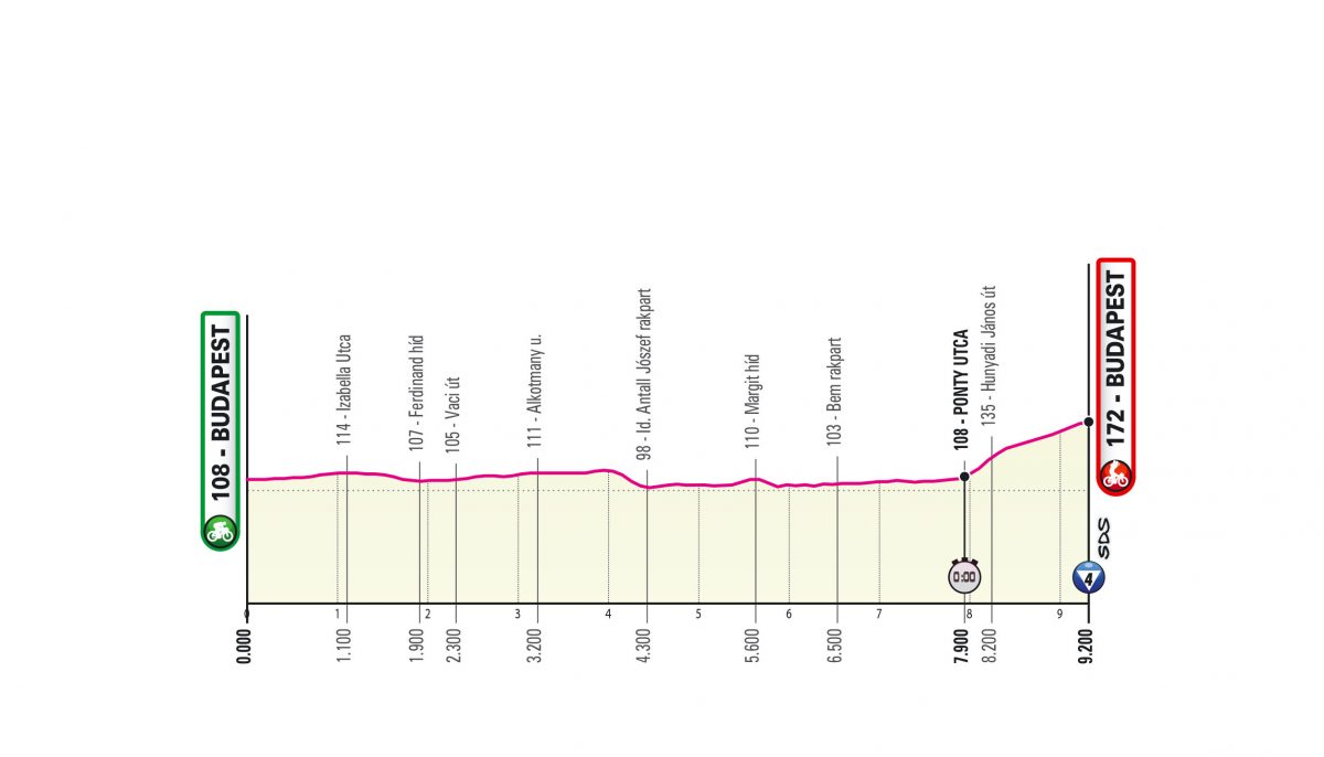 ブダペストへ戻っての第2ステージは、9.2km個人タイムトライアル。中心街をスタートしてドナウ川沿いを進んだのち、最後の1.3kmで一気の上り。特に最初の300mは最大勾配14%に達する。上りの入口に中間計測ポイントが置かれる予定で、それまでにどれだけタイムを稼ぎ、最終盤の登坂で耐えられるかがカギとなってくる。