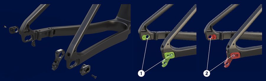 ライディングスタイルや走る路面、選択するタイヤ幅によってリアセンター⻑を2段階に調整可能な「フリップチップ」システムを採用