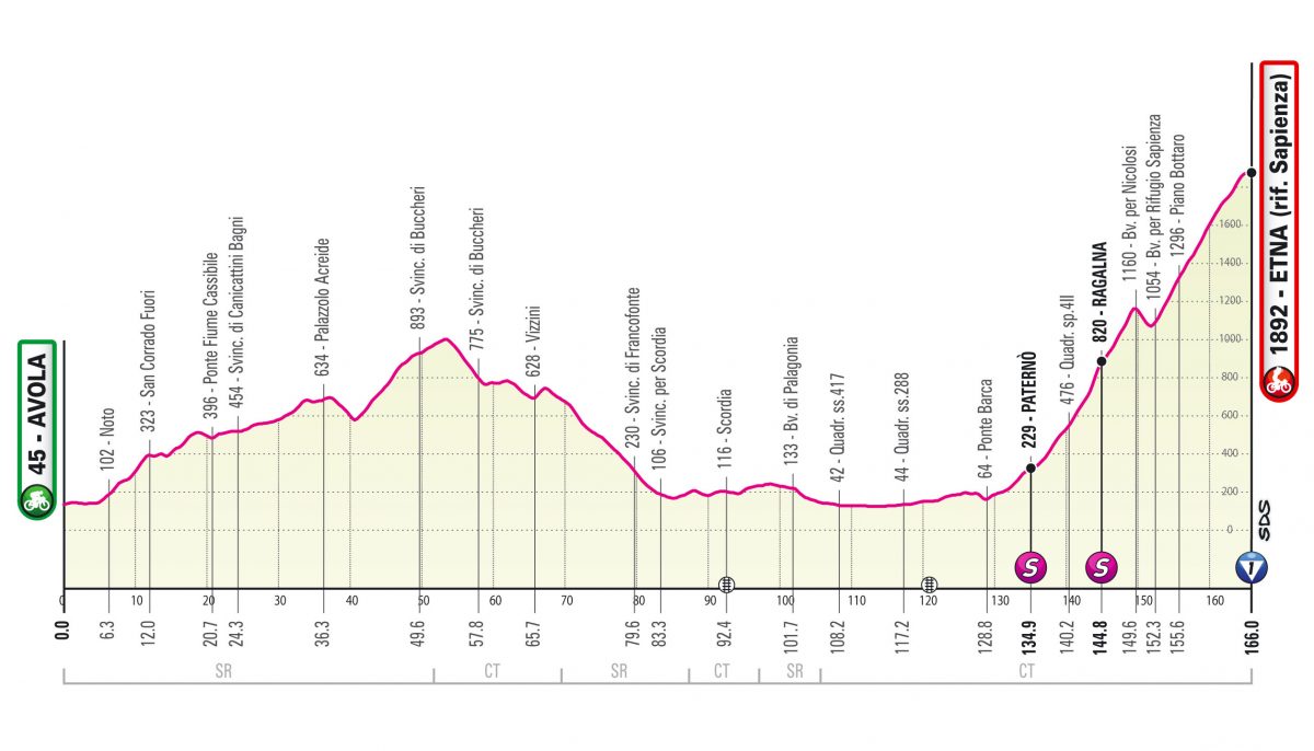 イタリアでの初日となる第4ステージは、今大会最初の山頂フィニッシュとしてエトナ山を上る。ルート的には2018年にも採用された南側のラガルナからの登坂。中腹に控えるわずかな下りも特徴的だ。翌日の第5ステージまでシチリア島を走る。