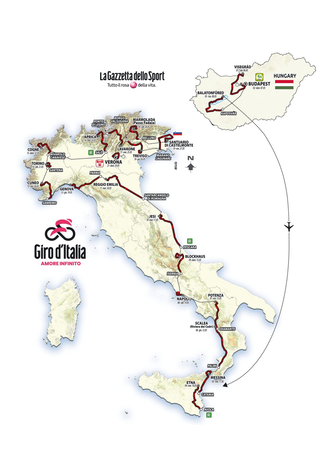 ジロ2022の開幕は56日。すでに発表されているとおり、ハンガリーの首都・ブダペストで幕を開ける。同国内では3ステージを走った後、イタリアへの移動日が設定される。目的地は南部のシチリア島だ。