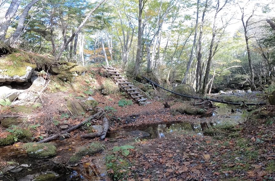 ズンズンと乗鞍の森の中へ進んでいくと、渡渉やバイクの担ぎが必要なシーンもあり、アドベンチャー感がたまらない。正直、クマでも出てきそうな雰囲気もあるので、ガイドツアーに参加するか、複数人でのグルーブライドをオススメしたい。クマ鈴などの携行は必須だろう。