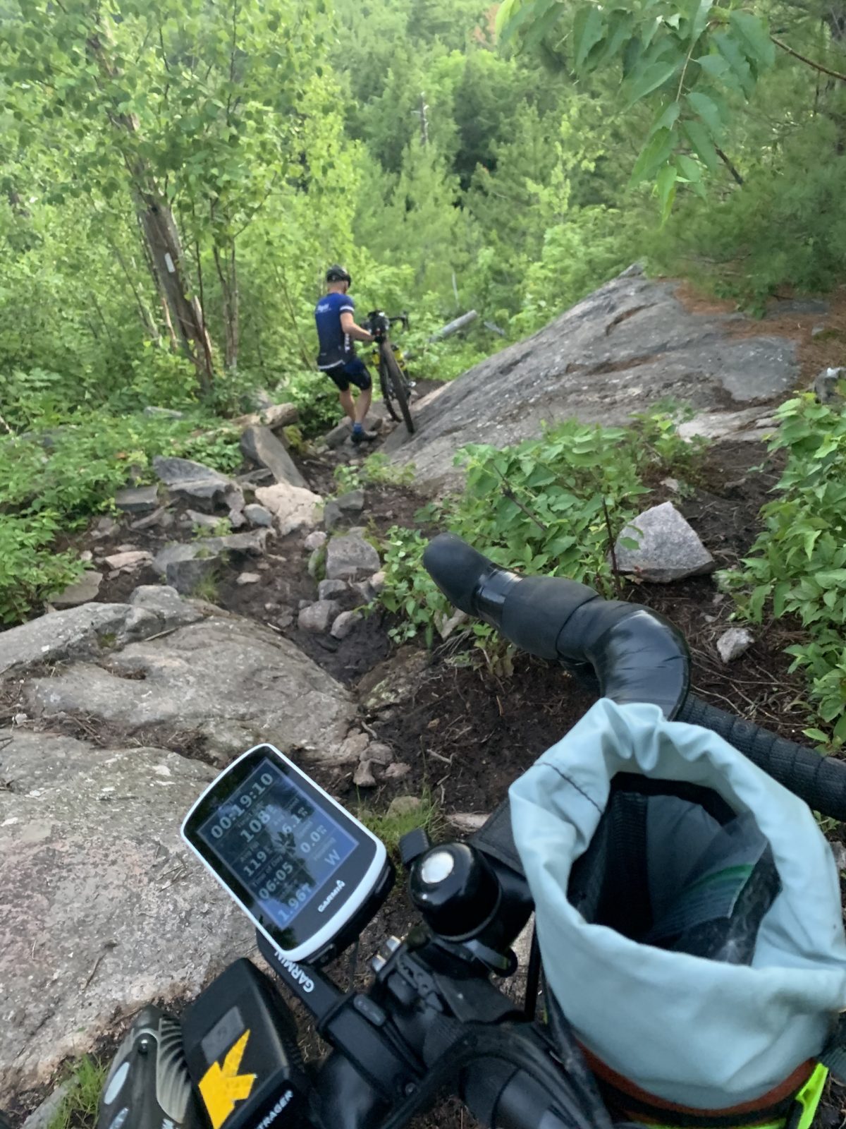 シングルトラックをしばらく走って、これまた絶景な岩登り。登ったものは下らないといけないので、急な斜面の怖い長い下りを一歩一歩注意して、自転車を横に進みました。