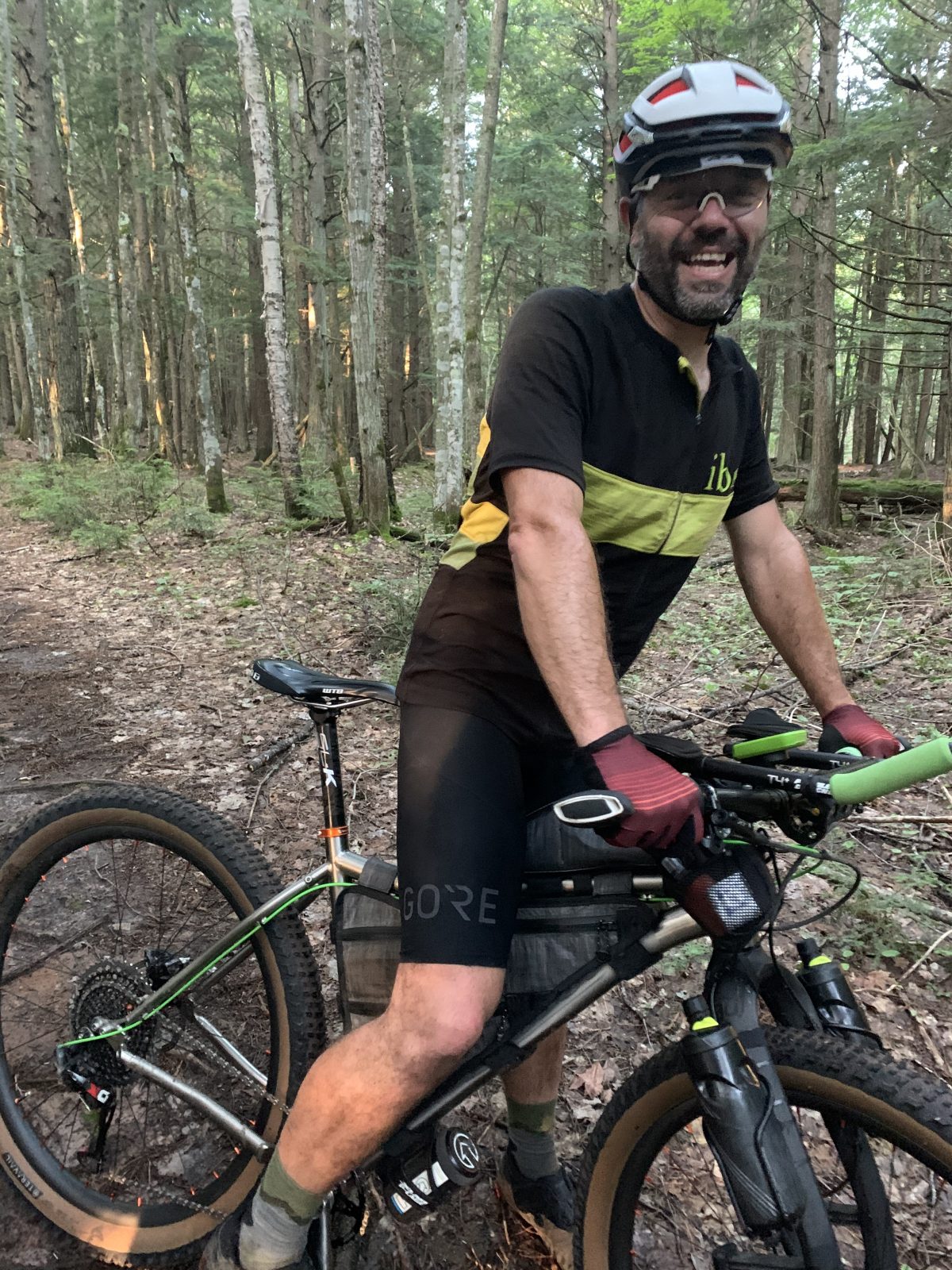 ミシガン州で一番高いマウント・アブロンまでの上りの道のりは、アップビートで楽しく過ごしました。その後は、反対側への長いデコボコ下りとなります。4輪バギー専用トレイルで、2016年にCXバイクに35mmのタイヤでおっかなびっくりで下った覚えがありますが、数年のグラベル経験もあり、かなり自信もってハンドリングできました。