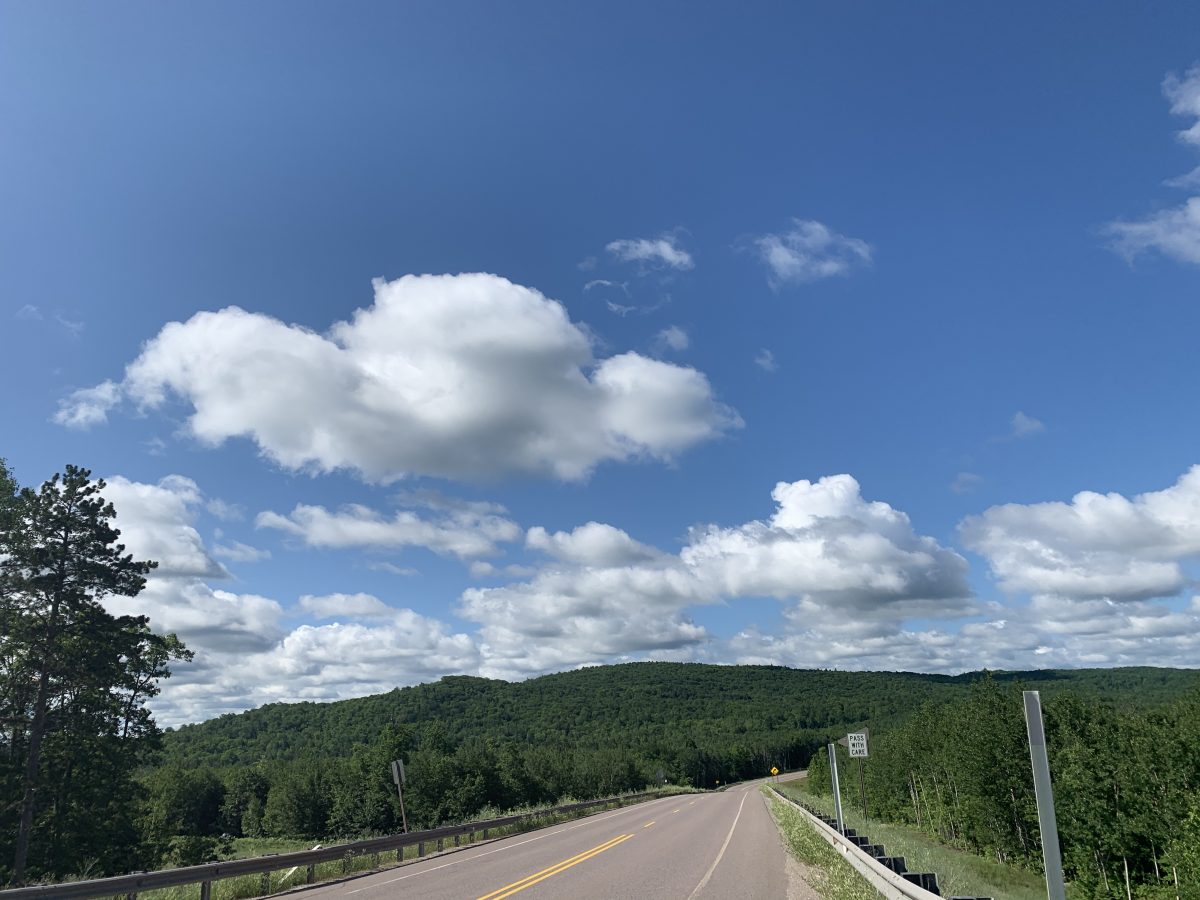 天気も気温もこれ以上良くならないだろうと言うほど! ヒューロン川がスペリオル湖に流れ出るところが自撮りスポットです。この日は水かさがあまりなく、歩いて渡るのに全く問題ありませんでしたが、かなり深くなる日もあるようです。キャンプ場が近くにあり、たくさん人がいました。いつかここまでバイクで走って一晩キャンプして、翌日残りを走るのも悪くないな、と思いました。