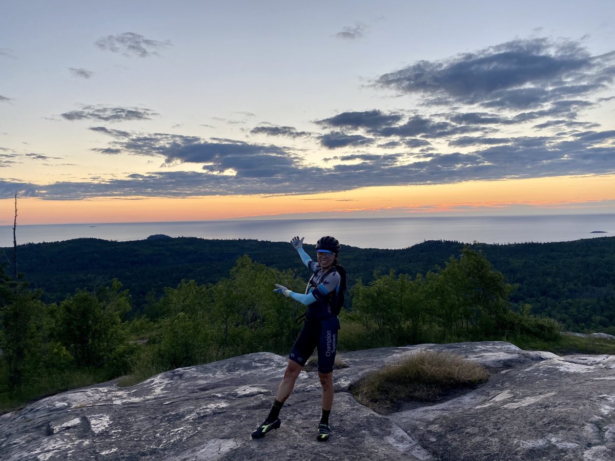 機材チョイスがどうのと言うレベルではありません。バイクを押して引き摺って、協力し合わないと登り切れませんでした。空が明るくなってきていたので、足場は確認できました。一筋縄ではいかないものの、やっとの思いでホグバック・マウンテンと呼ばれる頂上に到着して、そこから拝んだパノラミックな五大湖・スペリオル湖からの登る日の出の景色は、息を呑むほど綺麗でした。開始地点からたった3.5kmのこの場所まで来るのに、すでに1時間は経過していました。