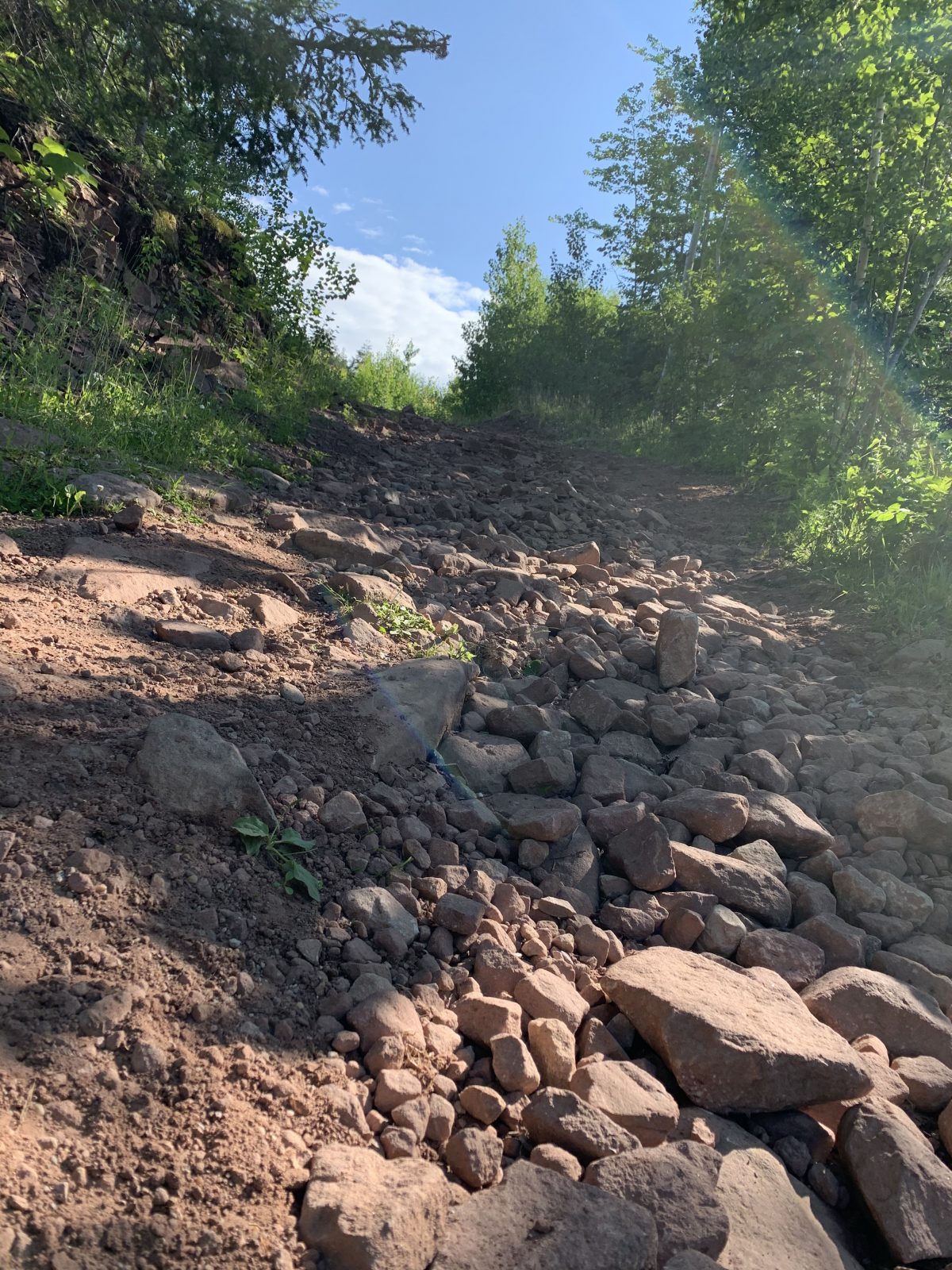 ミシガン州で一番高いマウント・アブロンまでの上りの道のりは、アップビートで楽しく過ごしました。その後は、反対側への長いデコボコ下りとなります。4輪バギー専用トレイルで、2016年にCXバイクに35mmのタイヤでおっかなびっくりで下った覚えがありますが、数年のグラベル経験もあり、かなり自信もってハンドリングできました。