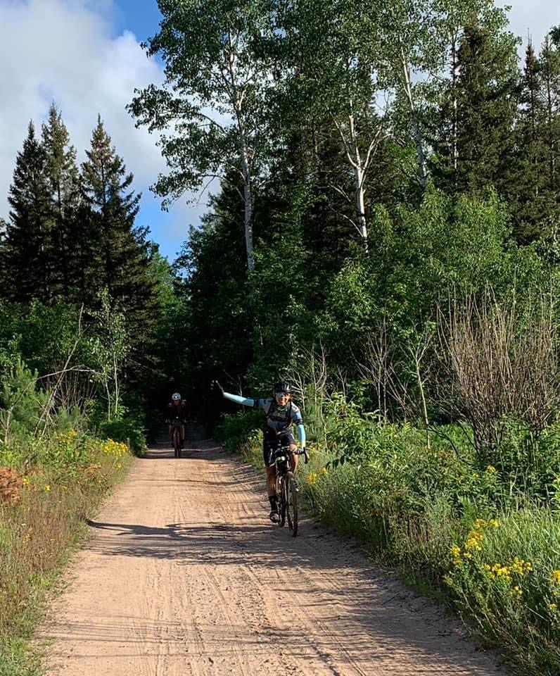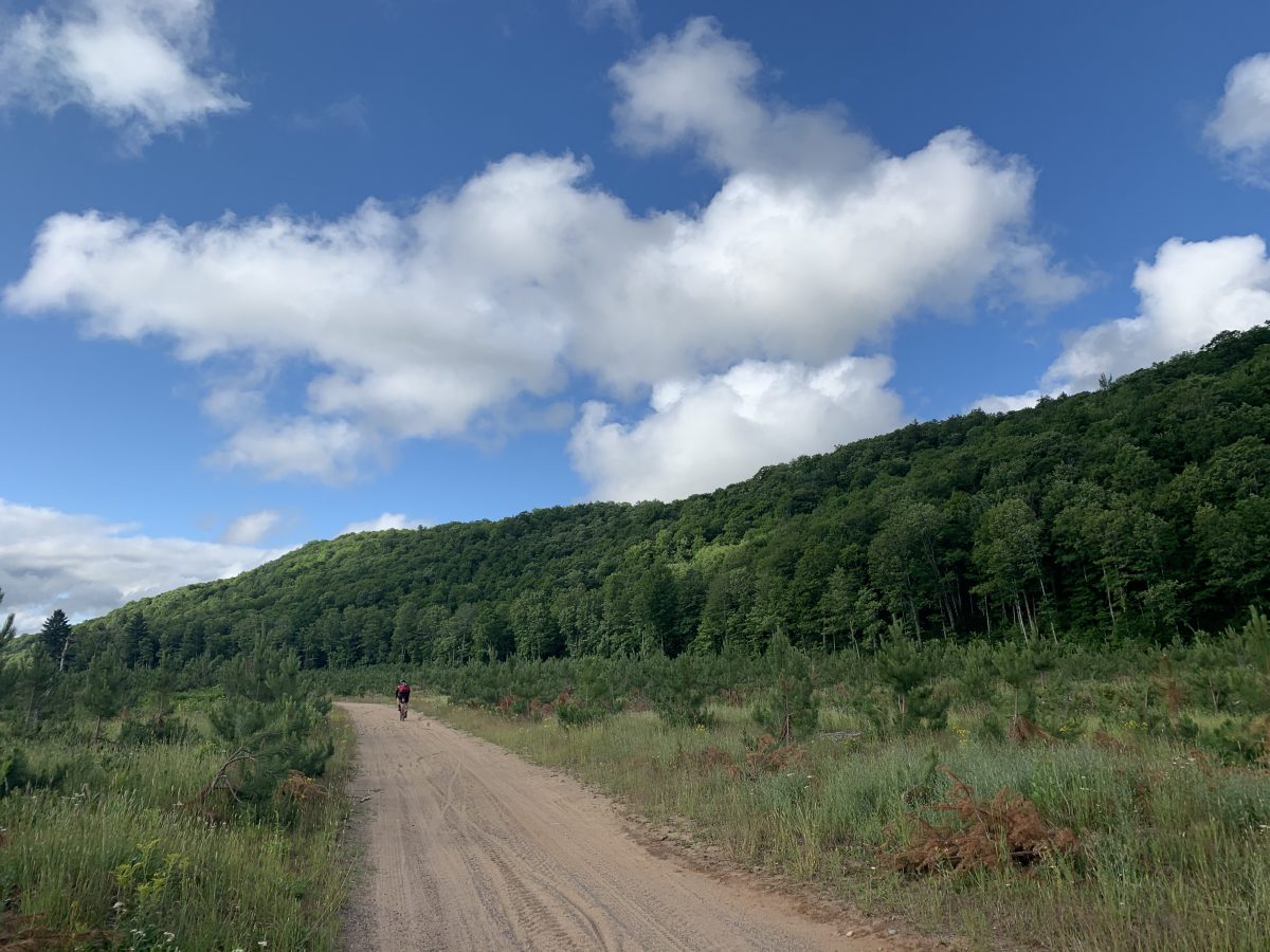 森から出て視界が開け、乾いたグラベルロードが目の前にありました。これは久し振りにスピードが出せそう、と思って喜んだのも束の間、100メートルも進むことなく間違いだと気付きました。地面は「細い」43cタイヤには柔らかすぎる乾いたフワフワの砂でした。くねくねタイヤ跡を残しながらまたしてもスロー走行となりました。