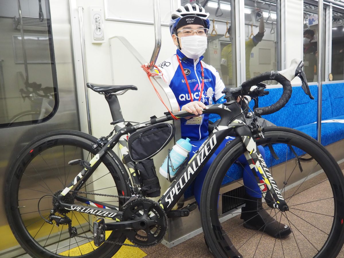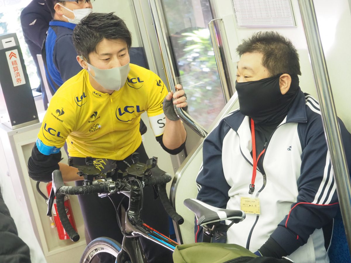 臨時サイクルトレインに乗り込む参加者。自転車を軽く持ち上げ車両内部へ