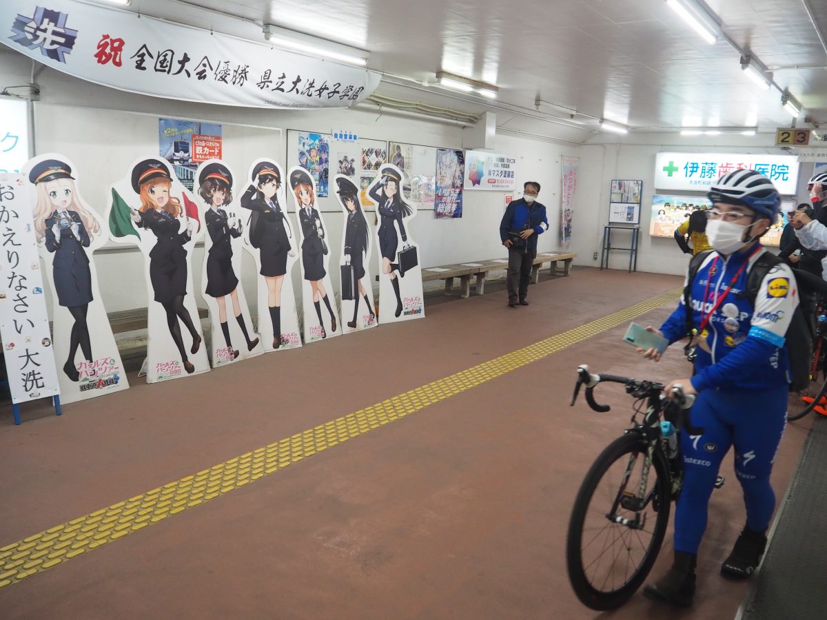 職員の指示に従ってホーム内を移動。大洗といえばアニメ「ガ-ルズ&パンツァー」の聖地だ