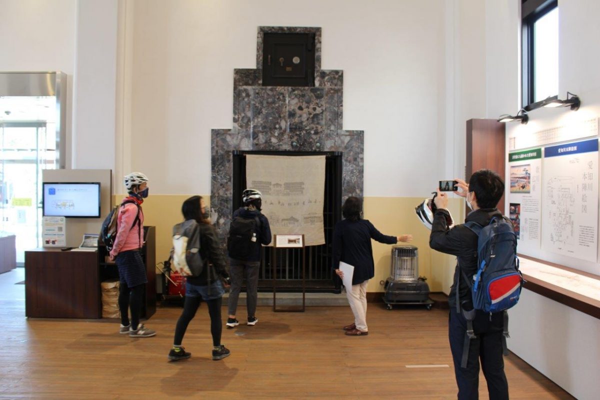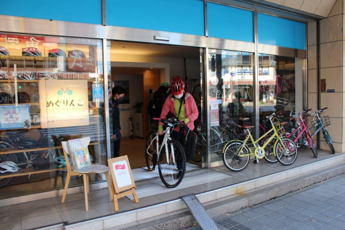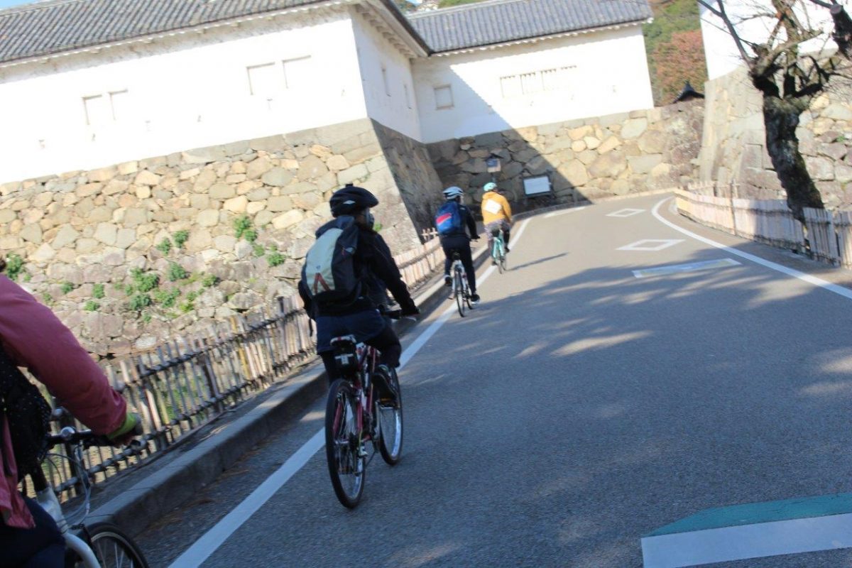 今回のツアーを企画したのは、滋賀県観光振興局ビワイチ推進室(←すごいですね、県の部署にこんなのがあるんですよ)、そしてプラス・サイクル推進協議会。バイシクルクラブをはじめとしたメディアと、ガイド役の田中将人さん(びわ湖のカナタ)、植田真貴さん(マッキサイクルズ)らで、彦根駅前の「めぐりんこ」から出発した。