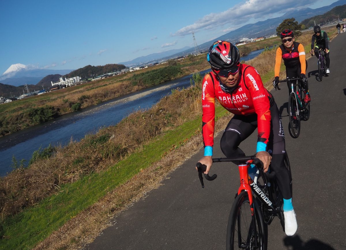ゆっくりペースでの平坦川沿いコース走行なので、新城、増田両選手ともに非常にリラックスした様子。参加者と気軽にコミュニケーションをとりながら狩野川沿いをサイクリングを楽しんだ。