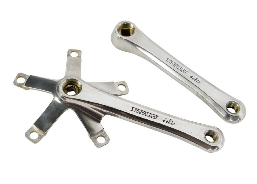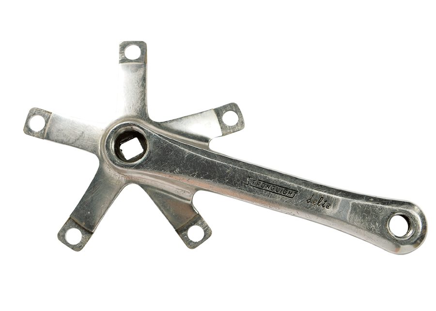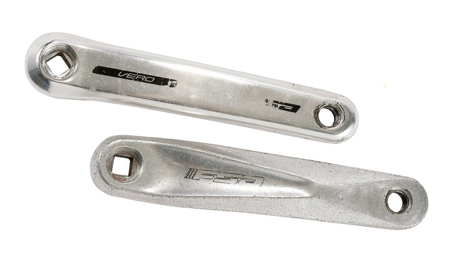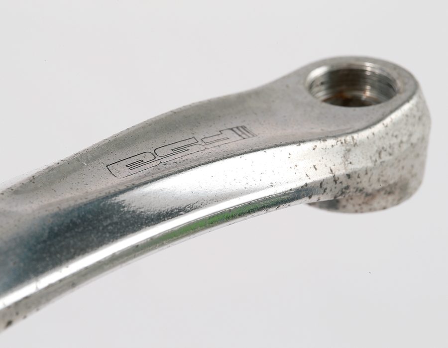 アルマイト仕上げの古いクランク。細かい傷が多数あるが、アルマイトの表面コートがジャマして磨くことができない