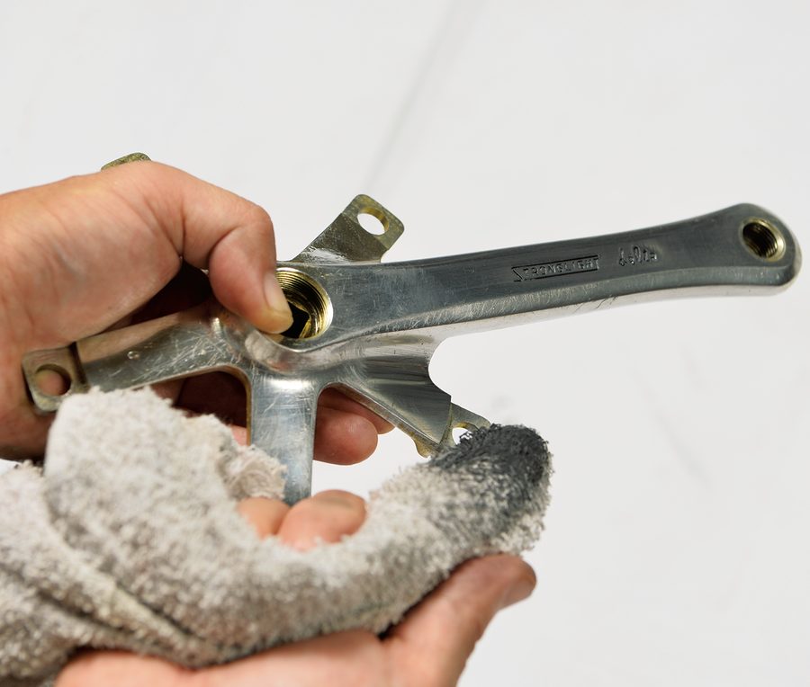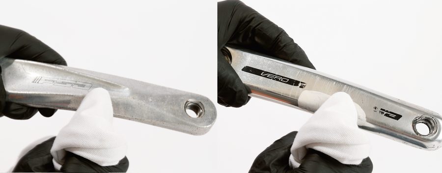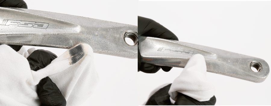 同じくピカールで拭いてみる。右のアルマイト処理されたクランクは、わずかにウエスに汚れがつくだけで黒くはならない。この場合は光らず、いくら拭いてもこすり傷は取れない