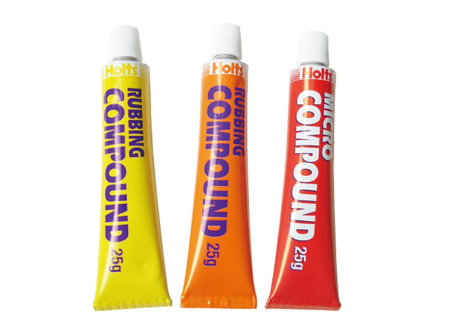 カー用品ショップにあるホルツのコンパウンド。3本セットで左から粗目、細目、仕上げ用に分かれる。傷の状況に応じて使い分ける