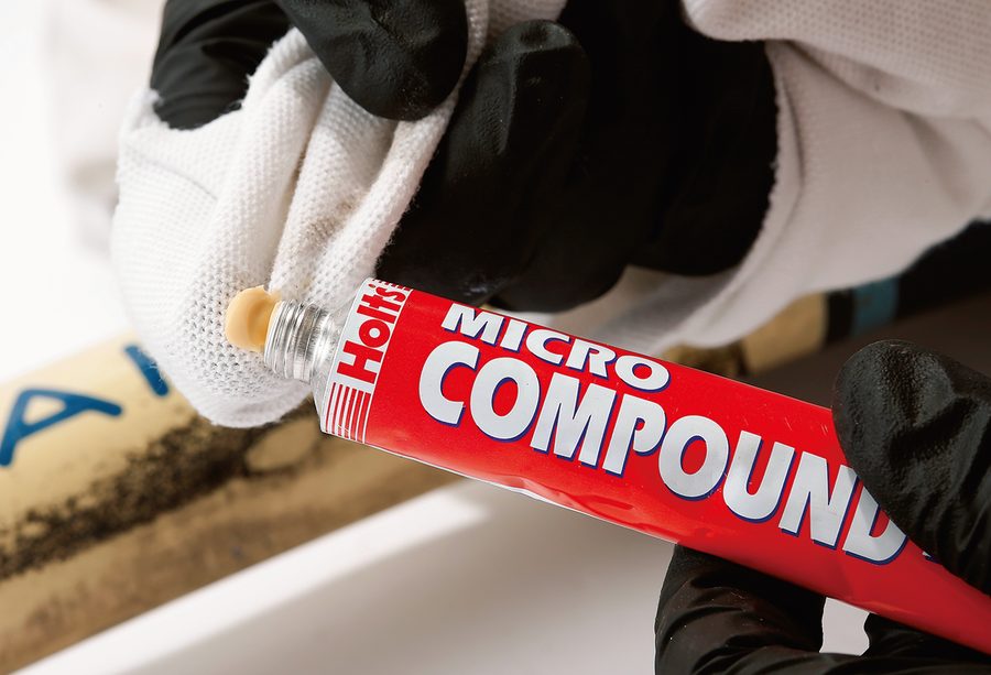 汚れが落ちたら、フレームを磨いていく。とれない黒ずみや黄ばんだ表面やこすり傷を、コンパウンドで微細に削ることでキレイにする。ポイントは、目が細かく弱めのコンパウンドで始めること。最初から深く削らなくてすむのでそれですめばよし、ダメなら強めの粗目コンパウンドを使う。
