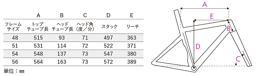 フレーム重量は51サイズで前作の800gから695gへ。56サイズでは130gもの軽量化(前作比16%削減)を達成。また、ヘッドチューブ剛性を最適化し、快適性も向上させている。