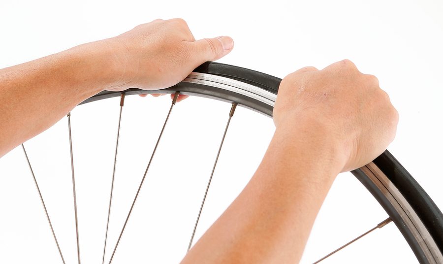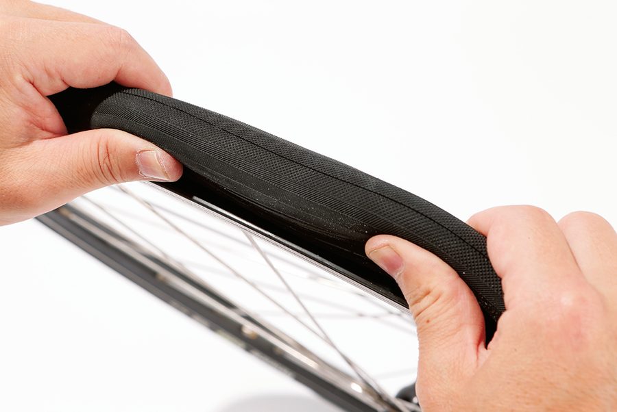 親指の腹で絞り込むようにして、タイヤのビードを押し込んでいく。最後までグイグイ押していけば、このようにタイヤが入る